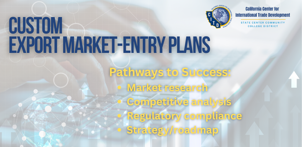 The California Center for International Trade Development (CITD) is offering a limited number of Custom Market-Entry Plans—funded exclusively to support California small businesses ready to expand into global markets. These individualized plans provide data-driven market selection, competitive landscape analysis, regulatory insights, and actionable entry strategies tailored to each business’s products and growth objectives. For new exporters, this support eliminates the uncertainty and high upfront costs typically associated with entering foreign markets, helping them make informed decisions, mitigate risks, and accelerate their international sales potential. With only a limited number of plans available, this is a valuable opportunity for small businesses to gain expert guidance and position themselves for long-term success in international trade.